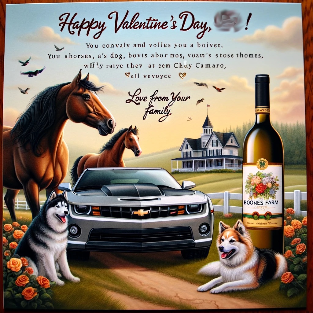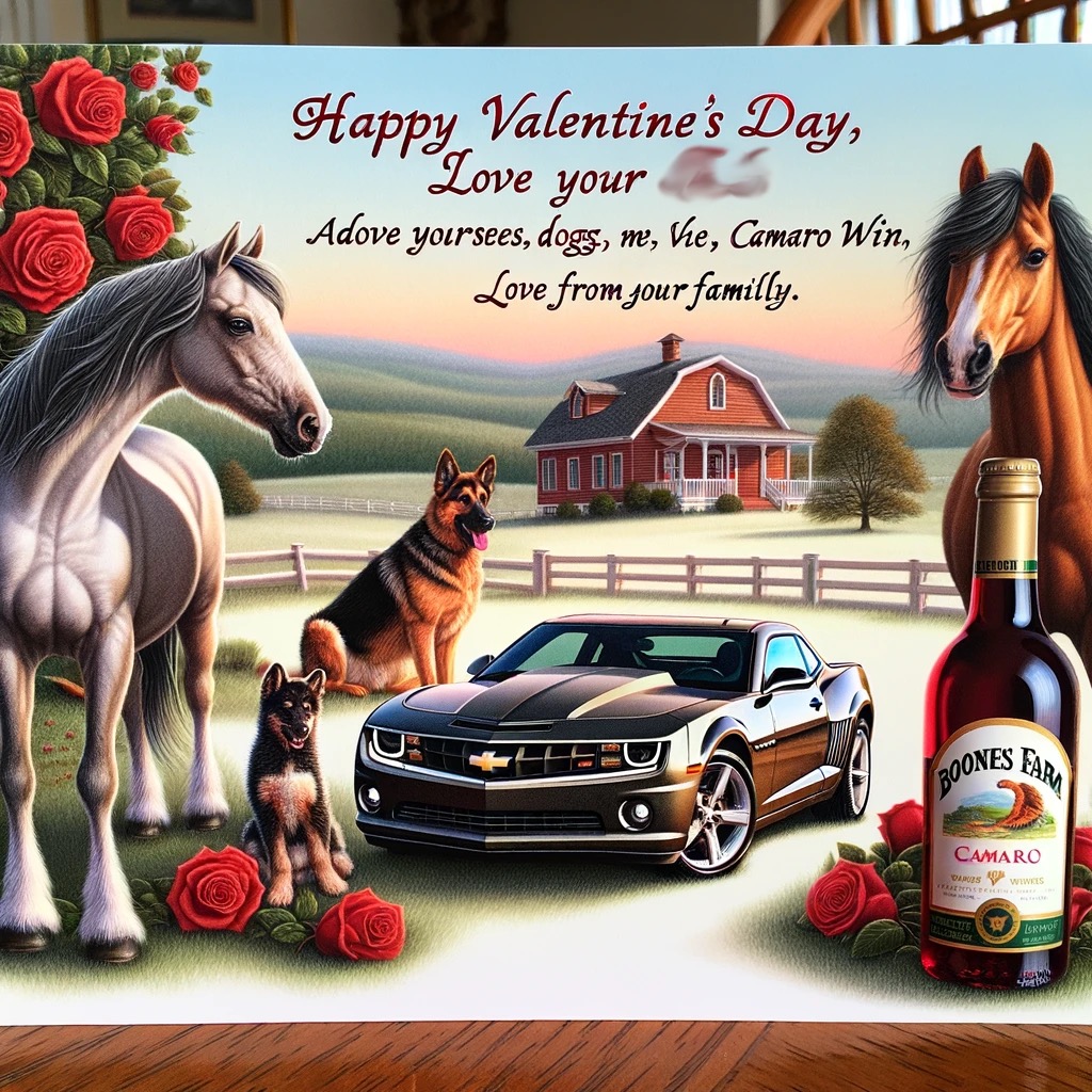 Amazing! Can you make a Valentine’s Day card for my sister? She loves horses, dogs and her Chevy Camaro and she likes Boones Farm Wine.