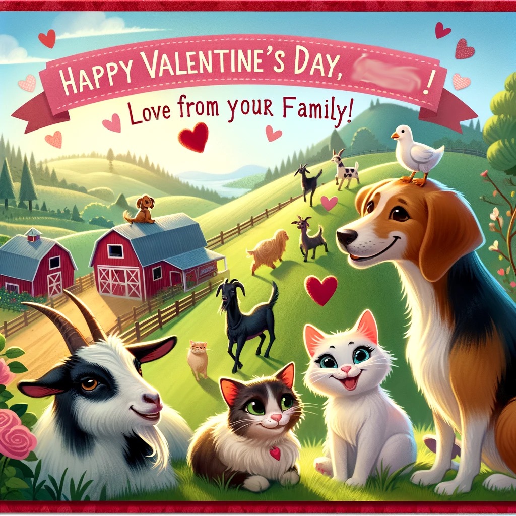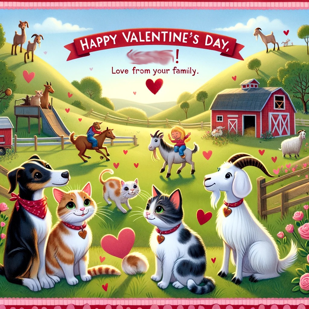 Can you make a valentine for my Niece #1? She likes goats, cats and dogs, and lives on a farm with a steep hill