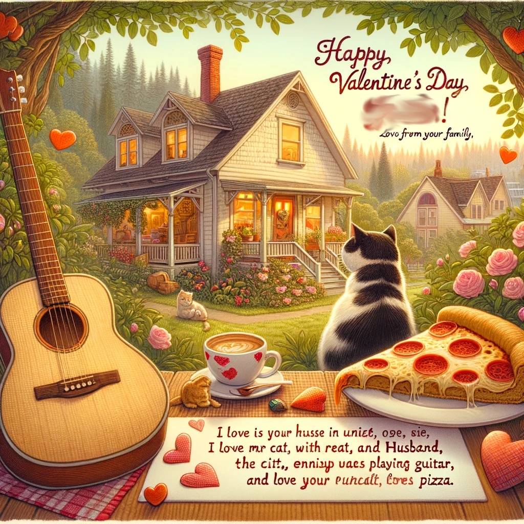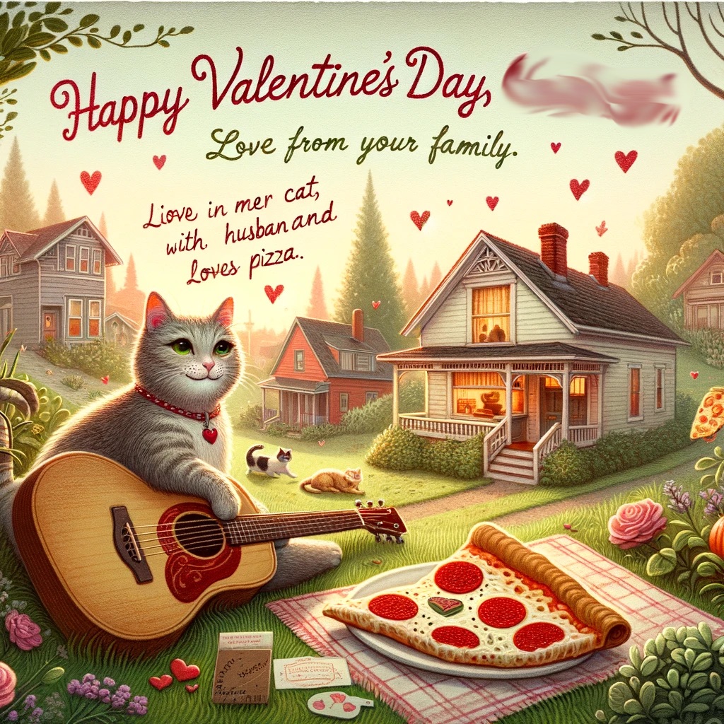 Very nice. Can you make a Valentine’s Day card for my Niece #3? She lives in a cute little house in Portland Oregon with her cat and husband, plays guitar and loves pizza.