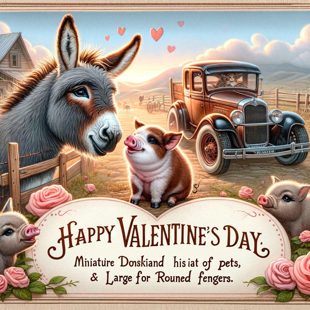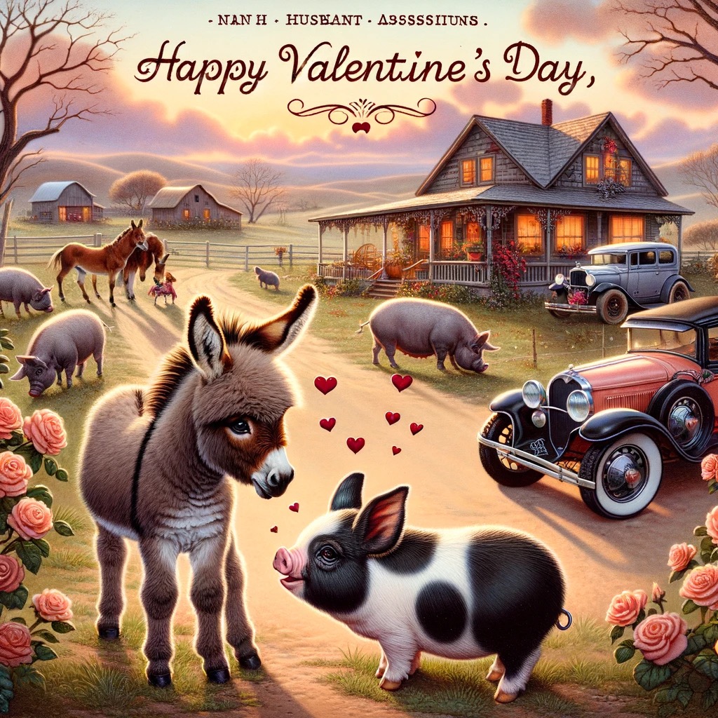 Awesome! Can you make a Valentine’s Day card for my Niece #4 Sarah? She loves her husband and all her pets including a pair of miniature donkeys, a large pot-belly pig and a 1930’s antique car with rounded fenders.
