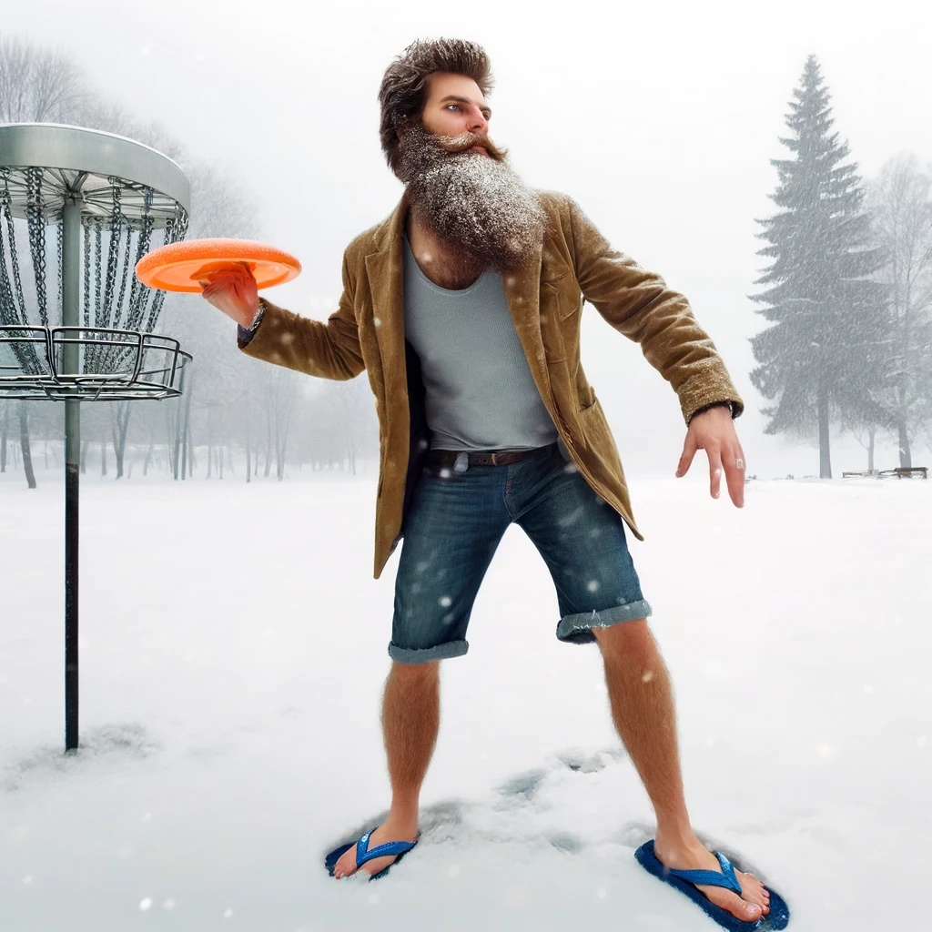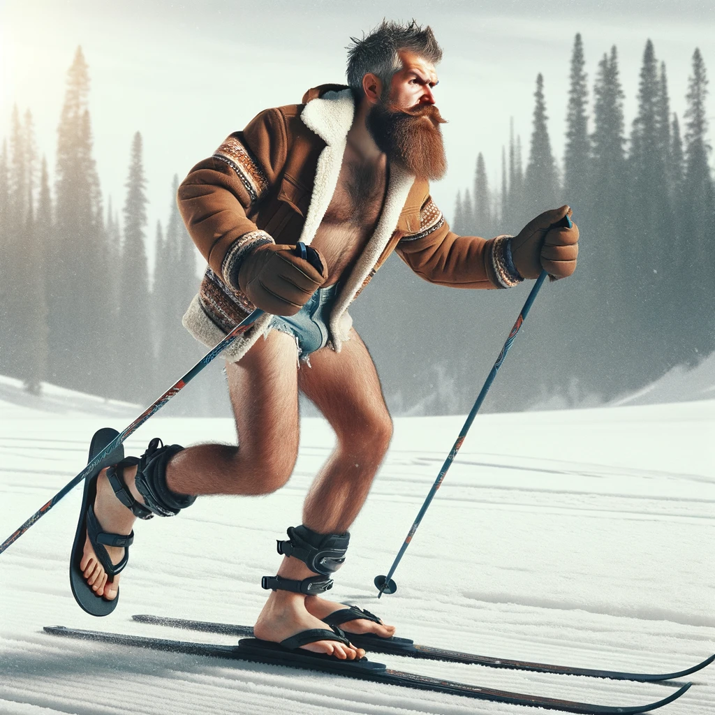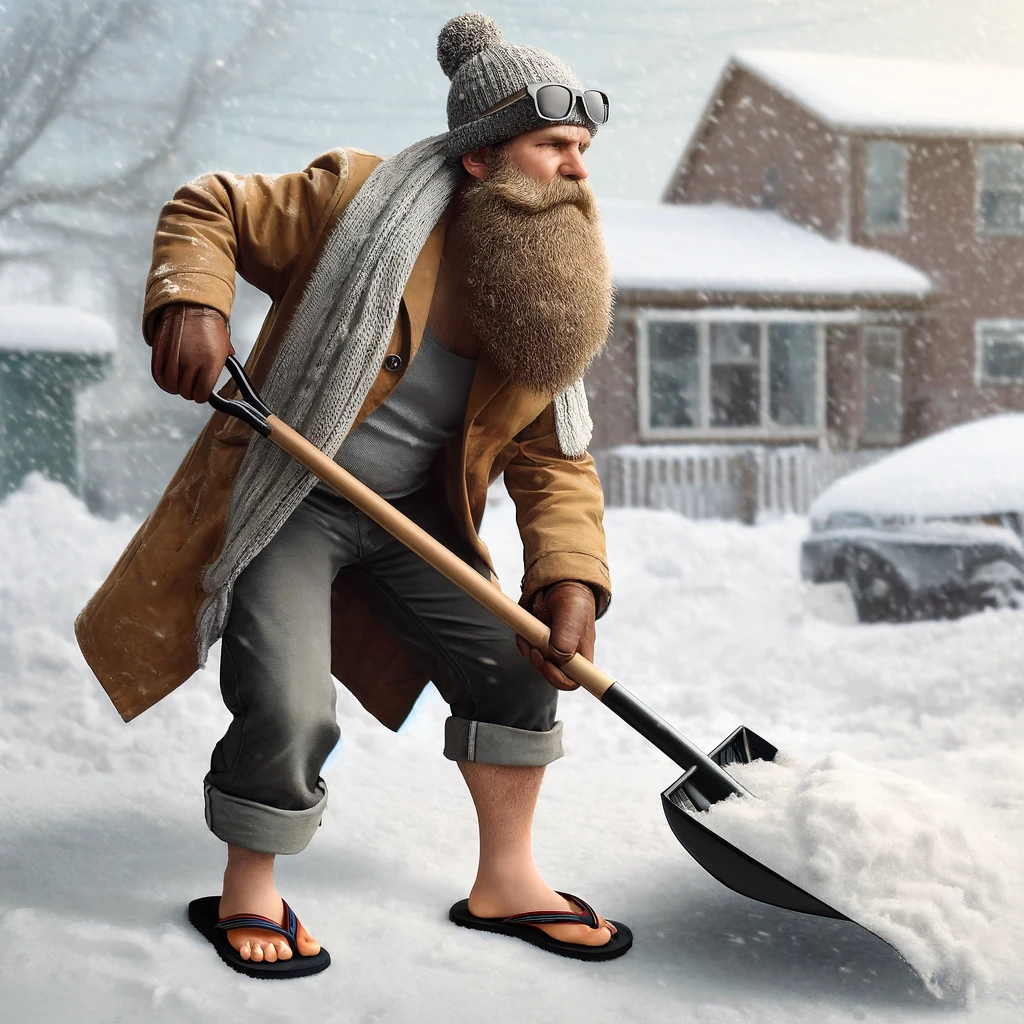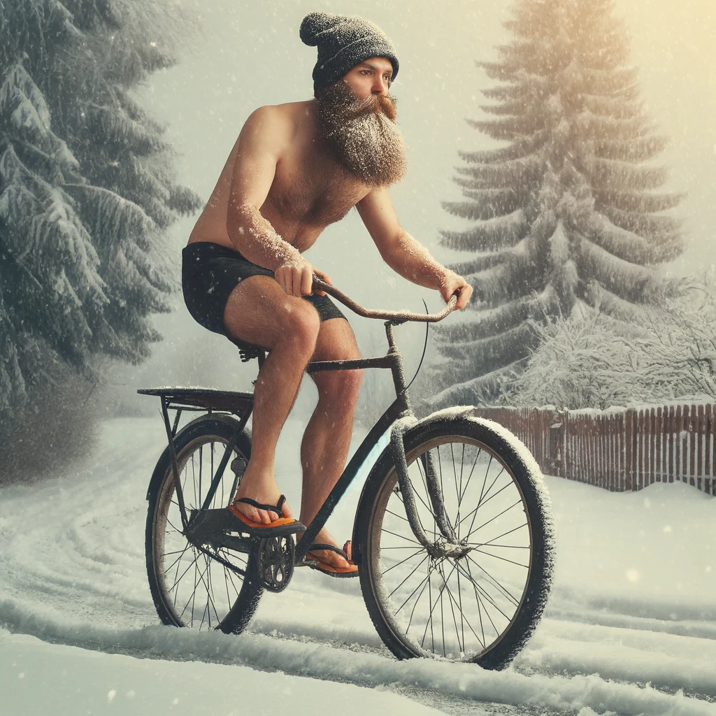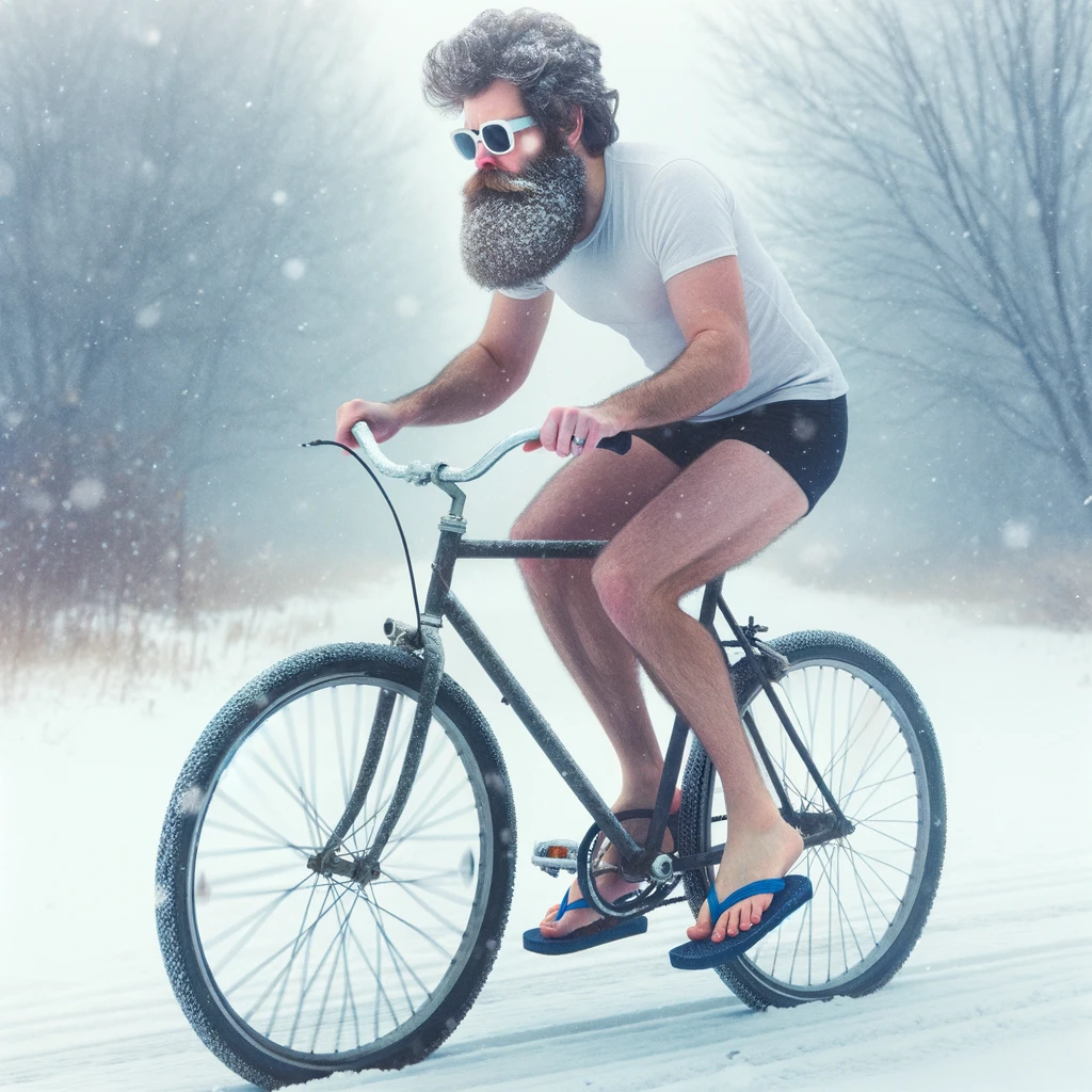 bearded man wearing flip-flops and a t-shirt riding a bike in the snow
