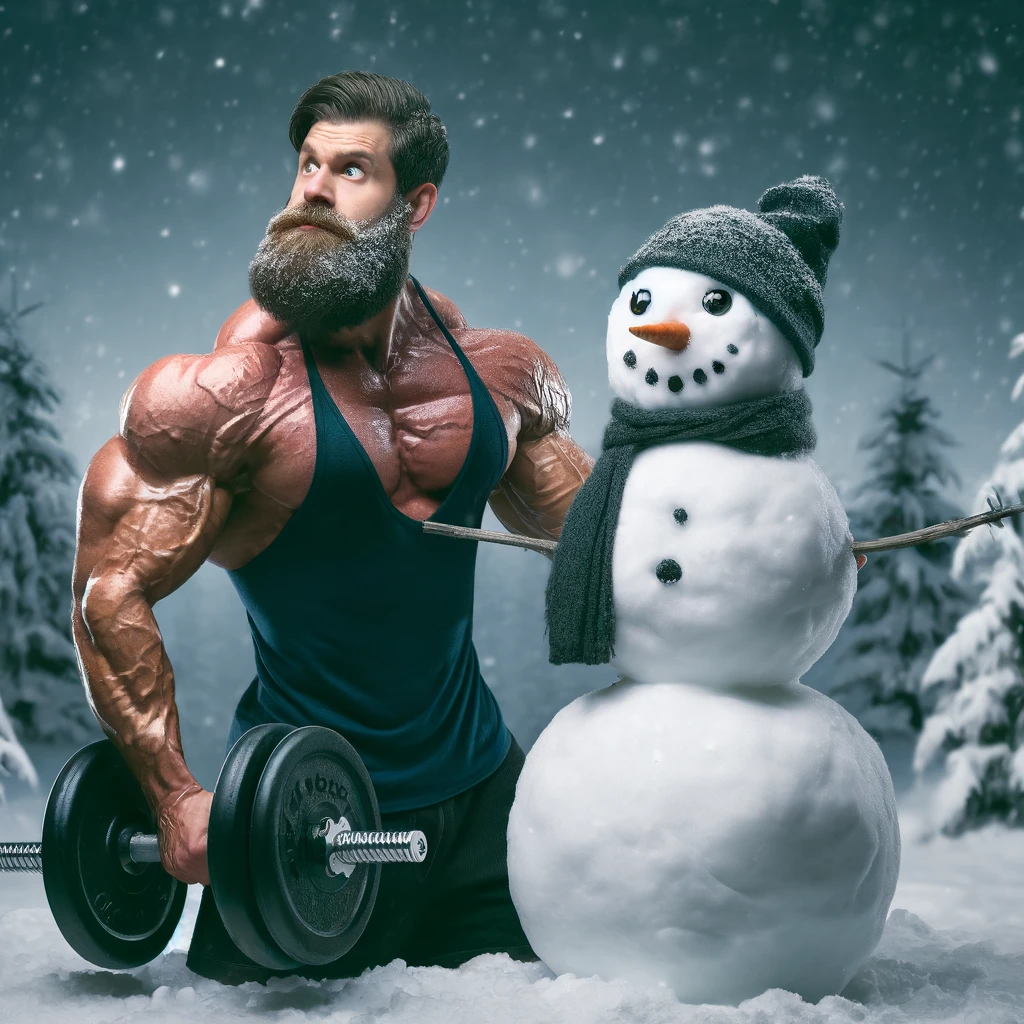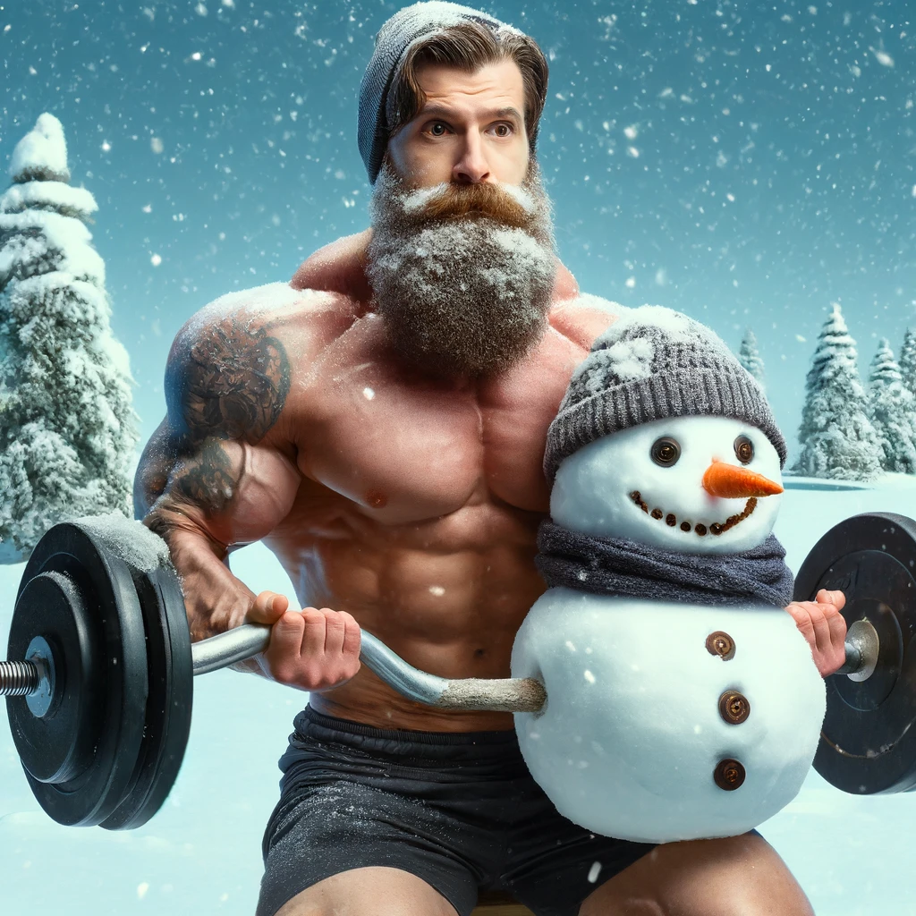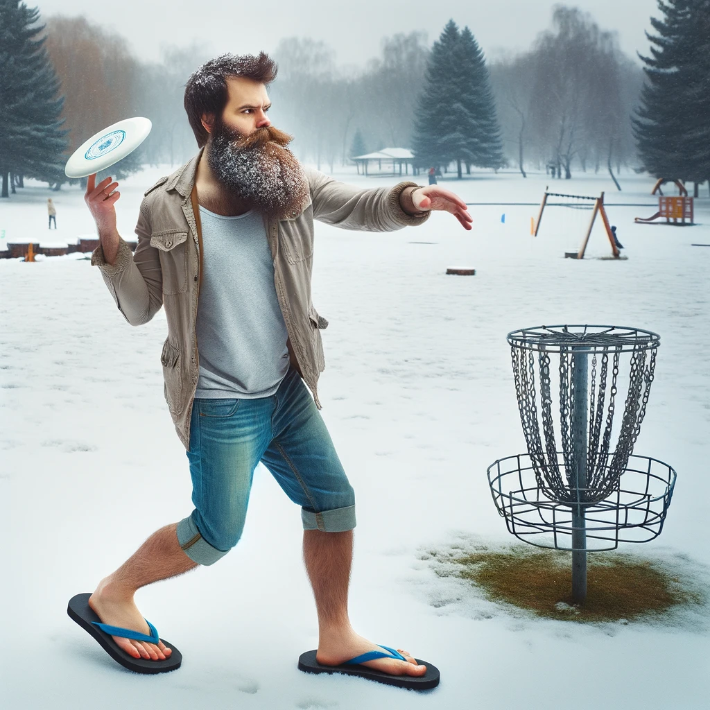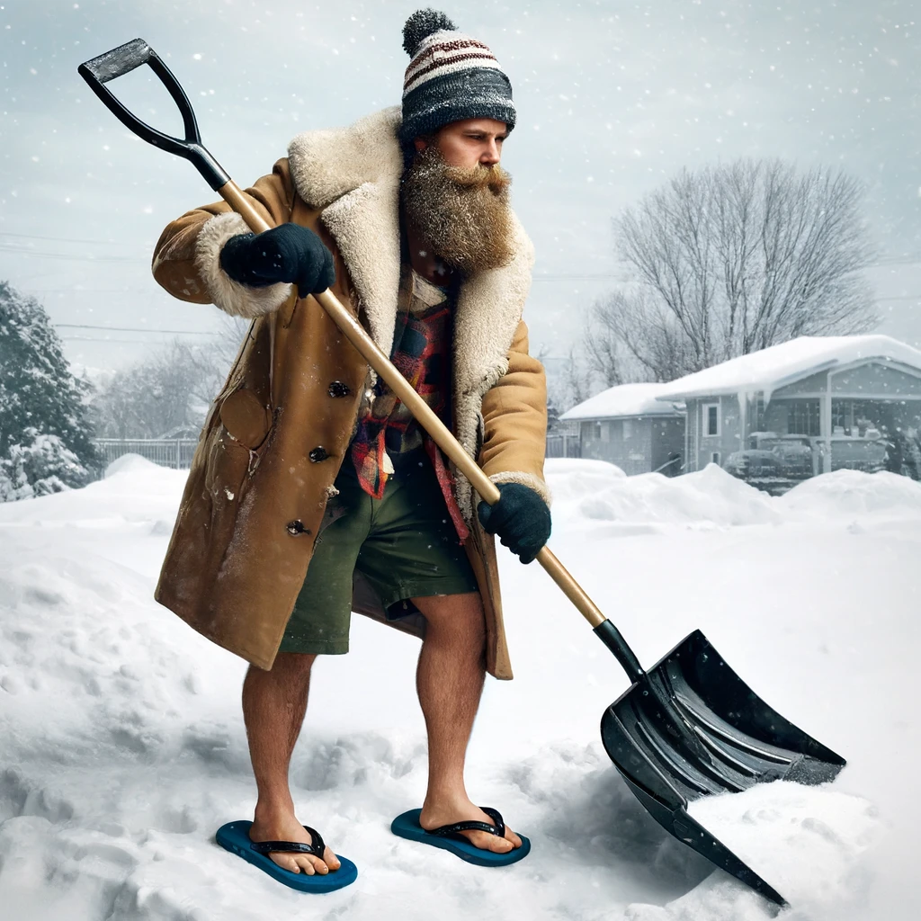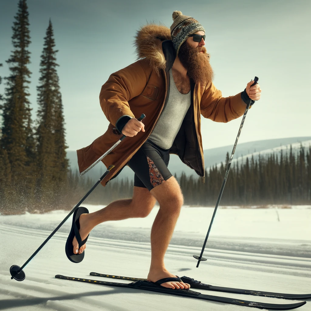 bearded man wearing flip-flops and a t-shirt riding a bike in the snow