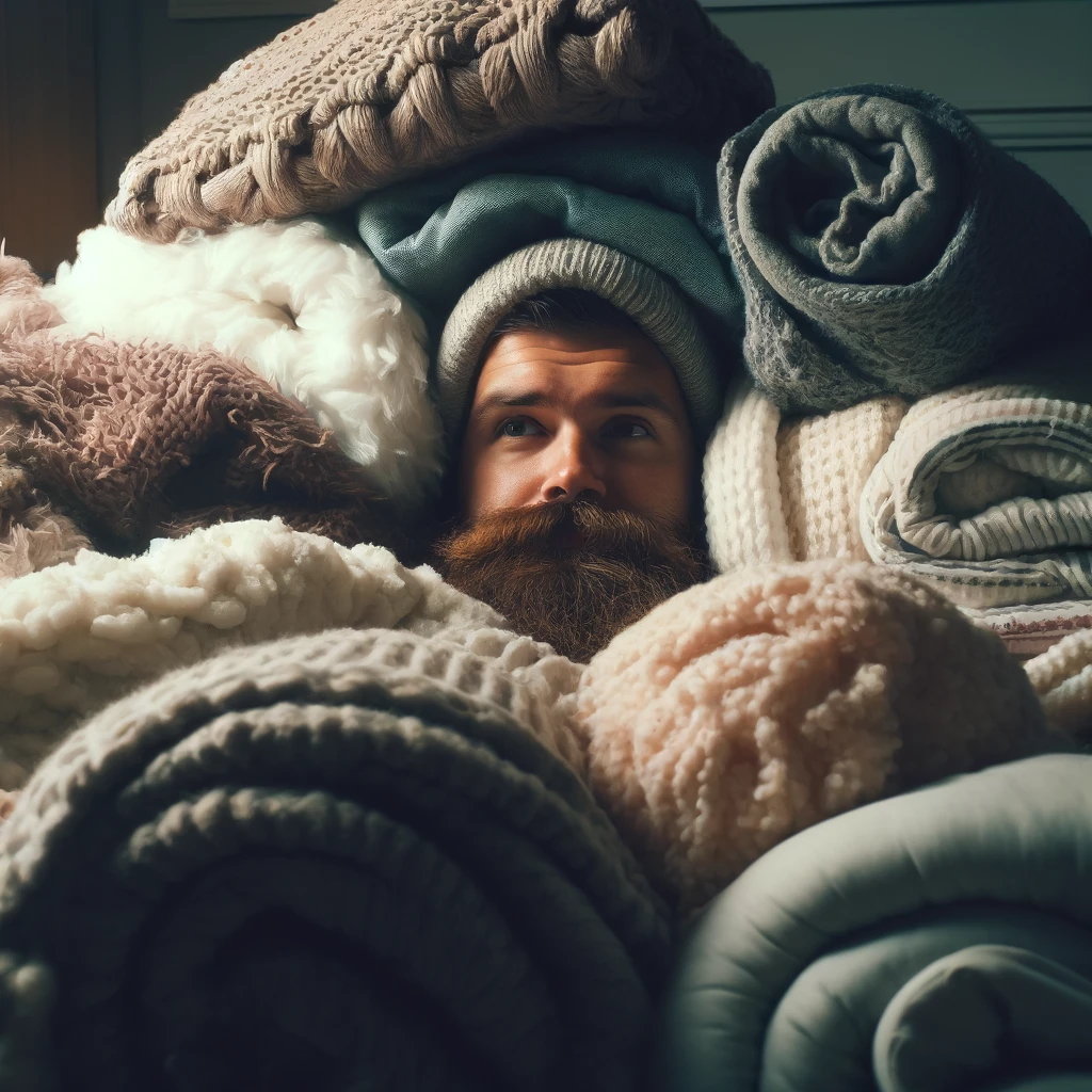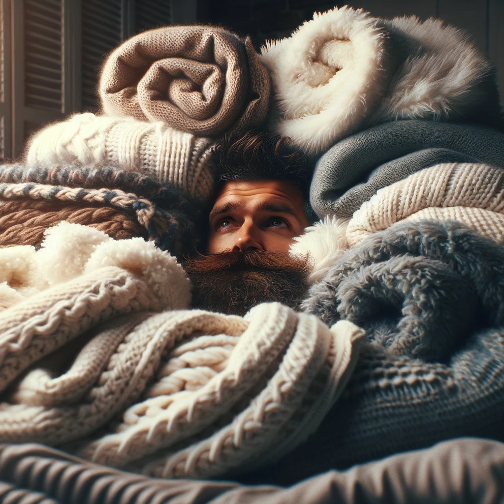 draw a bearded man in bed with three feet of blankets on him to keep warm