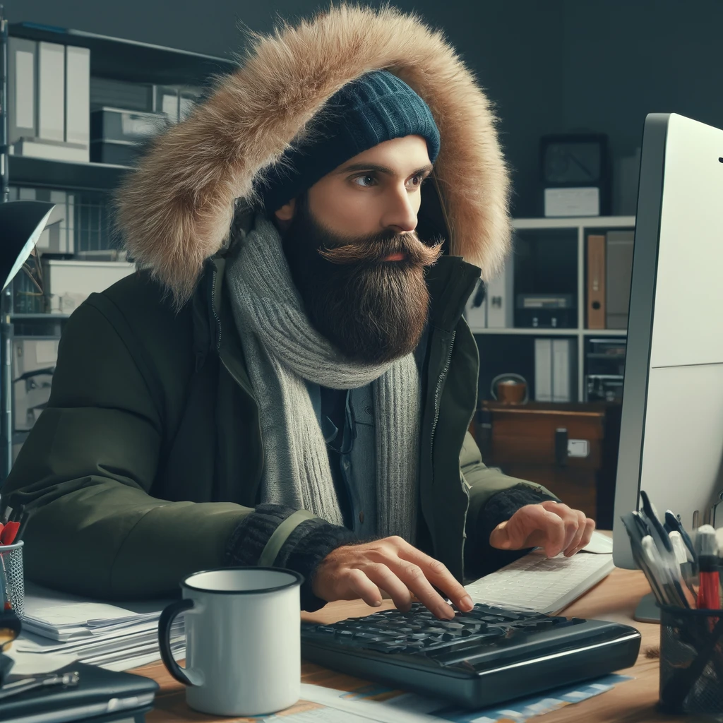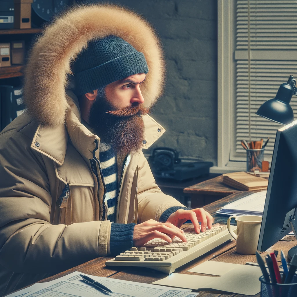 Bearded man sitting at a computer doing payroll while wearing a ski cap and parka