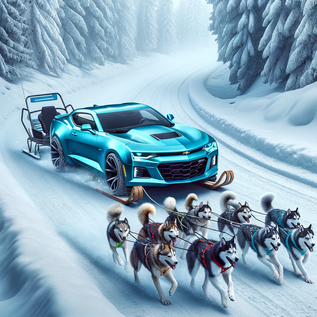 draw the husky sled, pulled by husky dogs, while replacing the sled with a camaro
