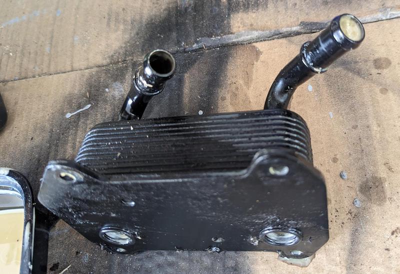 The oil radiator (oil cooler) was entirely plugged on the input side