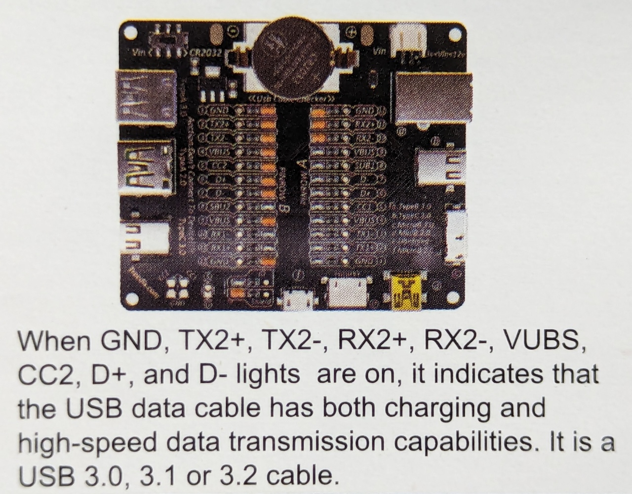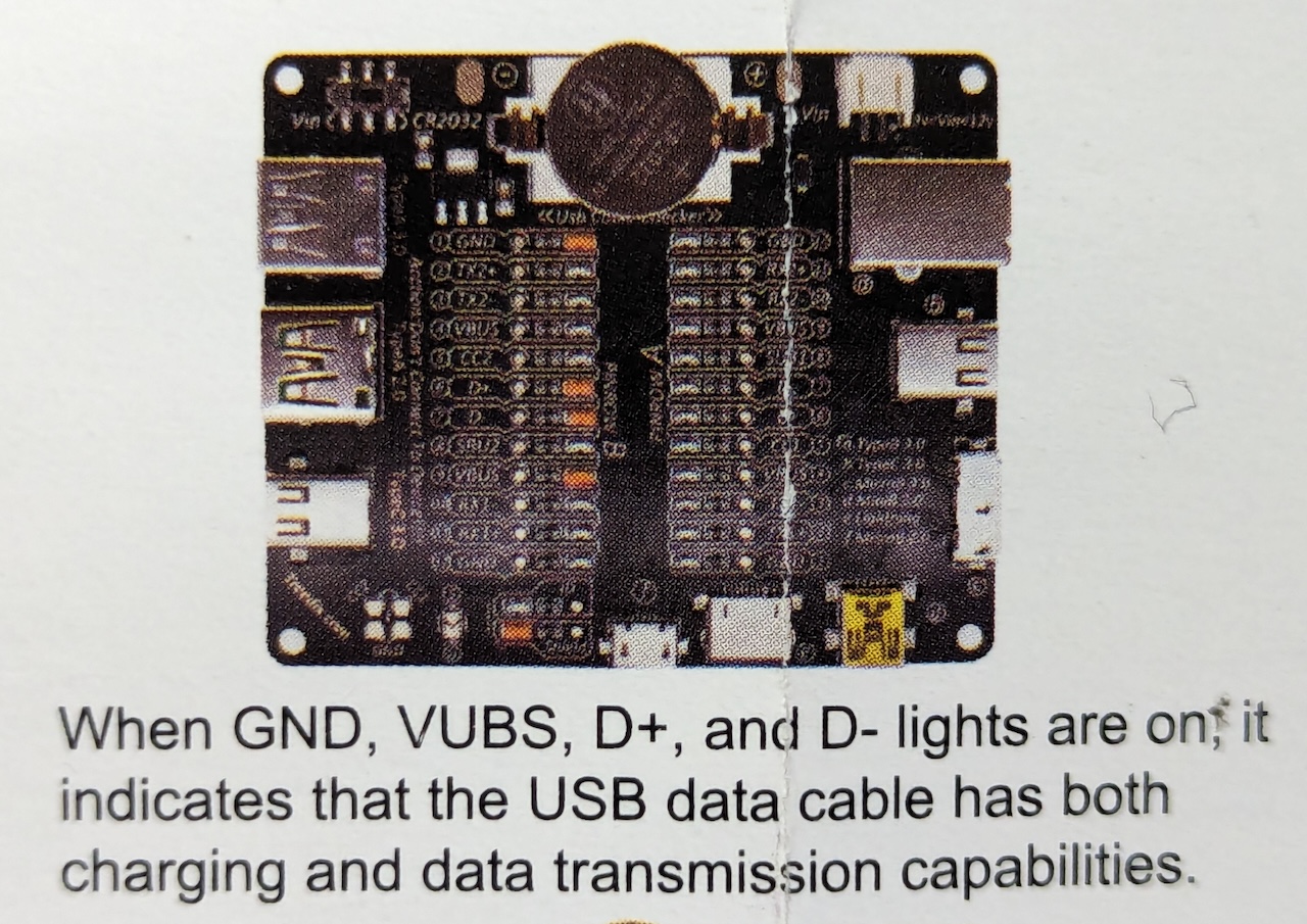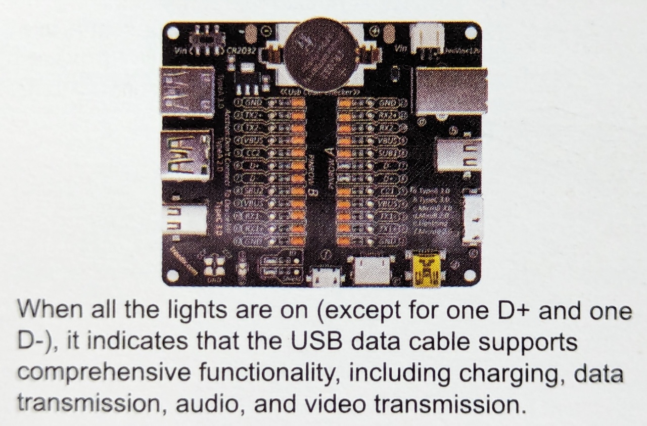 The activation of these lights on one pin row but not the other could suggest that while one end of the cable is properly connected for USB 2.0 data transfer, the other end may have a fault or disconnection in the D+ or D- lines. This would mean the cable might not be capable of proper data transmission across both ends. It’s important to ensure that both D+ and D- are functioning correctly for the cable to support standard USB data transfer capabilities.