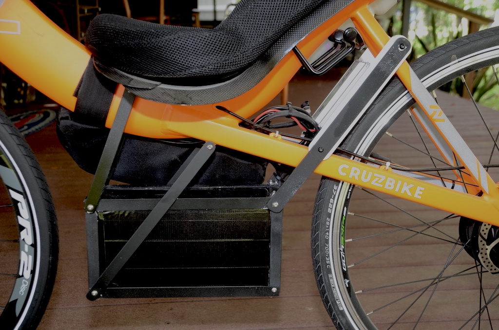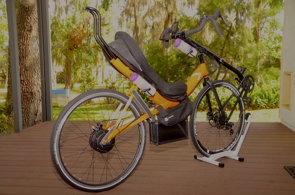The Cruzbike S40 Ebike is built on the Cruzbike S40 frame, a short-wheelbase high riding recumbent, a 500 watt (peak 1056 watt) motor, a 48 volt 20.8 Ah battery, disc brakes, SRAM components, Schwalbe Marathon Plus tires with custom battery bracket, custom controller bracket, and a custom torq arm. The bike is 2-wheel drive, the front wheel human is powered and the rear wheel is motorized. It was designed specifically for the Horrible Hundred bike event in Clermont Florida. If Florida was a pancake, the Horrible Hundred crosses over about 20 large blueberries.