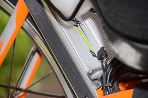 The location and construction of the battery bracket was a major design focus. The concern was that over time the aluminum attachments would fail due to the weight and shock of a heavy battery relentlessly pulling on the bike frame. The design has a rectangular bracket enclosing the battery and six separate attachment points to the frame to distribute the load. The main attachment point shares the attachments with the controller. This bracket provides both vertical support and horizontal support to keep the battery from swaying front to back and side to side.