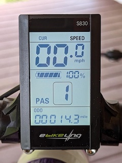 Like most road bikes, the CruzBike S40 does not have front or rear shocks with the only shock absorption being the slightly oversized Schwalbe Marathon Plus tires. Pumped up to 90 psi (6 bar), these tires require 22.6 watts to roll a load of 92.5 lb (42 kg) at 18 mph (29 kph). Just considering rolling resistance and ignoring wind resistance, elevation change, mechanical chain resistance, etc., this battery at 22.8 Ah, discharged at 39 V, use 811 Wh should last 35.8 hours. It appears this is far more battery than we need, and this is without pedaling!